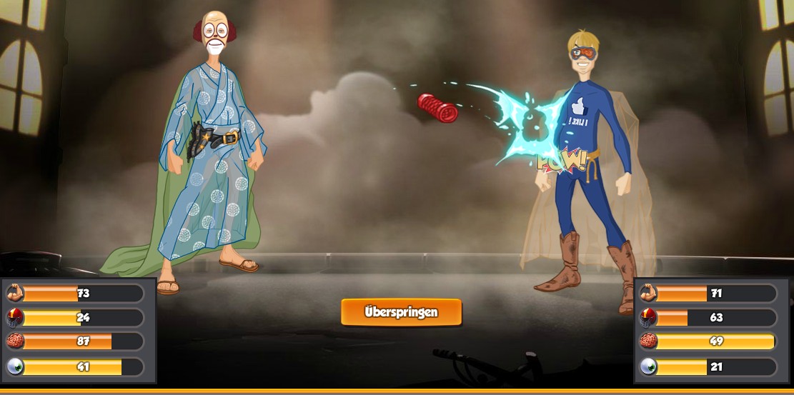 Missionen. Es gibt zwei Arten von Missionen, einmal "Zeit-Missionen" und einmal "Kampf-Missionen". Bei den Zeit-Missionen muss man einfach nur eine gewisse Zeitspanne abwarten um seine Belohnung zu erhalten, bei den Kampf-Missionen muss man zwar auch eine gewisse Zeit warten, jedoch kann man danach noch gegen einen Bösewicht kämpfen. Bei einem Kampf helfen euch wieder die Fähigkeiten, die ihr mit oben genannten Fähigkeitspunkten aufleveln könnt. Es gibt vier Fähigkeiten: Einmal die Kraft, wenn man diese Fähigkeit auflevelt erhöht sich der Schaden, den euer Held bei einem Schlag macht. Die nächste Fähigkeit ist die Kondition, die entscheidet, wie viele Schläge du einstecken kannst. Dann gibt es noch den Grips, der entscheidet wie viele kritische Treffer du verteilen kannst und als letztes die Intuition, mit deren Hilfe du generischen Schlägen ausweichen kannst. Je höher diese Fähigkeiten gelevelt werden, desto besser werden diese Fähigkeiten. Ihr könnt sie, wie oben gesagt, mit Kleidung und Gadgets erhöhen, außerdem könnt ihr sie mit Fertigkeitspunkten erhöhen, die ihr beim Levelaufstieg bekommt, oder mit eurem angesammelten Geld, dass ihr durch Missionen oder durch Duelle bekommt. Duelle sind Kämpfe gegen andere Spieler, bei denen eure Fähigkeiten entscheidend darüber sind, ob ihr euren Gegner schlagt oder nicht. Auf dem nächsten Bild seht ihr, wie ein Kampf aussieht. Man sieht seine eigenen Fähigkeiten und die des Gegners.