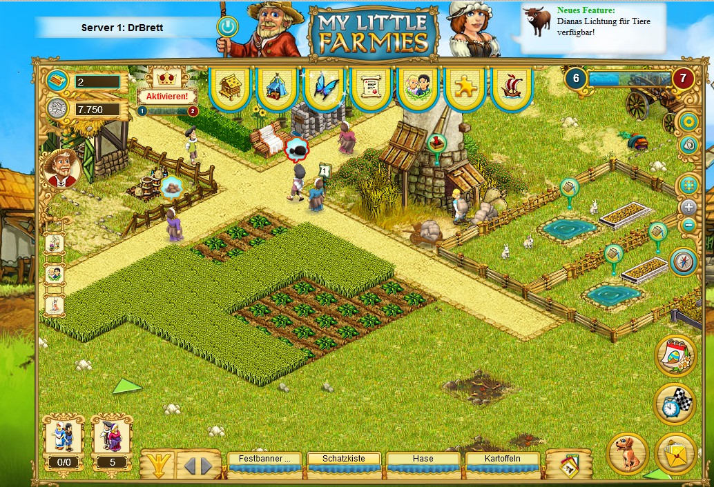Als ich auf der Suche nach neuen Spielen war, um Bananen zu sammeln, habe ich das Spiel My Little Farmies gefunden. Also habe ich mir direkt einen Account erstellt, und wollte mal sehen, wie viel Spaß mir dieses kleine Free2Play Browsergame denn bereiten kann. Als erstes konnte man sich zwischen zwei Servern einen aussuchen, wobei einem der "Server 1" als beste Wahl empfohlen wird. Danach startet man in eine kleine Farm, wo einem ein älterer Herr die ersten Aufgaben gibt, die man relativ schnell erledigen kann. Durch diese Aufgaben erhält man die Währung "Taler" welche durch das reine Spielen erworben werden kann. Mit der käuflichen Währung "Gold" kann man eigentlich nur die Zeit verkürzen, oder Dinge kaufen, wenn man keine Taler mehr hat, um diese bauen zu können.