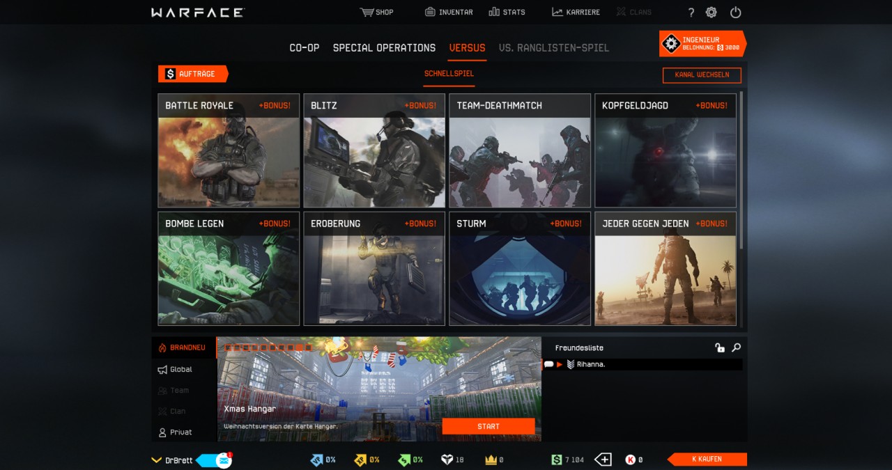 In diesem Screenshot seht ihr das Ingame Menü von Warface. Für ein Free2Play Shooter wirklich nett gestaltet. Außerdem gibt es wie in jedem Free2Play Spiel eine kaufbare Währung. Ich mag zwar generell diese Währungen nicht, man könnte sich auch mit Werbung oder sonstigen Möglichkeiten finanzieren, aber Warface hatzum Glück keinen Pay2Win Vorteil. Man kann sich Waffen kaufen, die ein anderes Design haben, aber keinerlei Vorteil. Nach dem man alle Tutorials überstanden hat, kann man im Versus spielen. Es gibt 8 verschiedene Spielmöglichkeiten, von denen ich bisher aber nur Team Deathmatch und Jeder gegen Jeden (Free for All) ausprobiert habe. Es gibt noch dazu ein Rank System, was ihr bei mir unten Links sehen könnt. Das heißt für jede Runde bekommt ihr XP, und mit diesen XP kann man im Rank aufsteigen, somit kann jeder sehen wieviel ihr schon gespielt habt.
