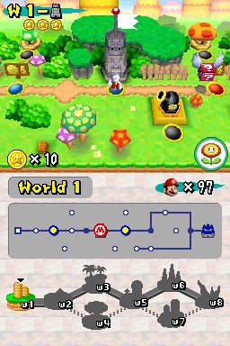 Kommen wir nun zum eigentlichen Thema dieses Reviews.New Super Mario Bros DS wurde am 30. Juni 2006 in Europa veröffentlicht. Das Spiel ist Grafisch sehr gut gestaltet und hat auch einen sehr guten Sound. Laut Angaben von Nintendo wurde das Spiel bereits über 30 Mio. -mal verkauft. New Super Mario Bros DS ist relativ gleich aufgebaut wie die Mario Spiele zuvor. Trotzdem gab es ein paar Änderungen und die Welten 4 und 7 konnten nur mit einem geheimen Pilz Trick beim Bowserkampf freigeschalten weden. Das Spiel besitzt 8 Welten und noch verschiedene Minigames. Jede Welt hat mindestens zwei Bosse. Es gibt verschieden Items zb: Mega Pilz, Feuerblume, blauer Panzer uvm. Sobald man das Spiel durchgespielt hat kann man mit einem kleine Trick (Tastenkombination), nach dem Abspann Luigi freischalten.