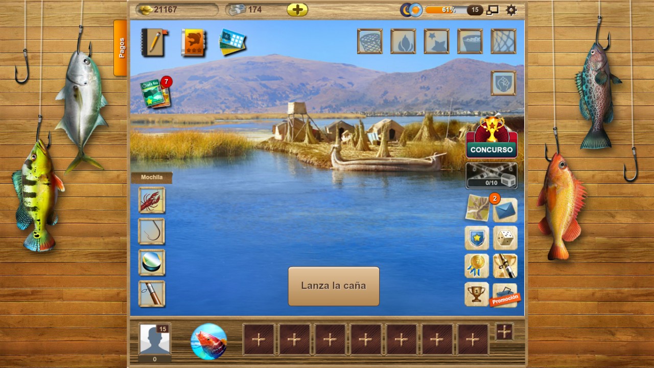 Al entrar en un área de pesca encontraras el paisaje del hábitat que puede ser un lago, laguna, mar, entre otros, y también encontraras diversas opciones o herramientas que te serán muy útiles a la hora de jugar, por ejemplo tenemos las opciones de carnada (acá podrás encontrar las diferentes carnadas que tienes en tu mochila y también puedes acceder a la tienda), la de el carrete (acá podrás seleccionar el tío de linea que deseas usar en la pesca y también puedes ingresar a la tienda para comprarla), la de la caña de pescar (acá podrás seleccionar la caña que deseas utilizar respecto al peso de los peces que deses) por otro lado podremos encontrar el libro de misiones y el libro de los diferentes peces y las diferentes opciones de torneos, campeonatos y la opción del mapa donde puedes ver cada uno de los continentes