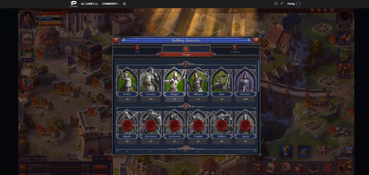 Otra de las cosas que hay que tener en cuenta es que no solo depende de la cantidad de tropas que tengas sino de la calidad del ejercito que tienes. Las armaduras y habilidad es lo que influye en el combate. para ello tienes que mejorar la herrería y la academia. En la academia podrás investigar nuevas tropas o mejorar a las que tienes. para poder investigar cada ves mas tendrás que mejorar este edificio, cada ves que investigues mas a tus tropas podrán dar mejores resultados en las batallas. Pero como todos sabes es que quien tiene la información de cuantas unidades tiene el enemigo o cuantas provisiones tiene, tendrá una gran ventaja en combate, para ello tienes a los espías los cuales te darán esta información, mientras mas espías tengas mejores resultados tendrás, a estas unidades también se les debe mejorar para que sean mejores en sus misiones.
