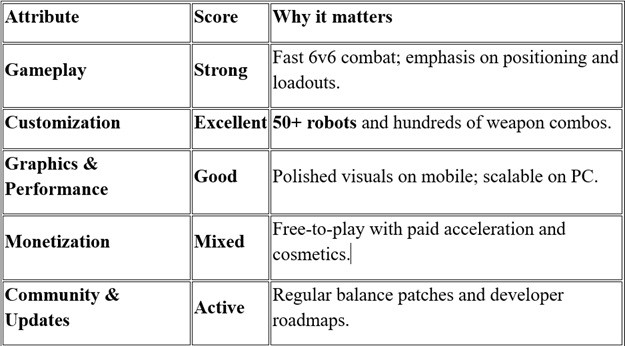 - Who this review is for: players who like team-based PvP, mech customization, and frequent balance updates.